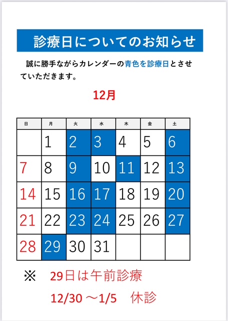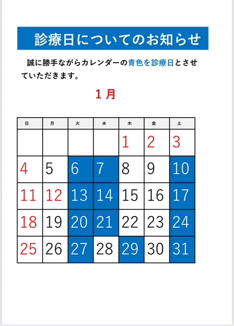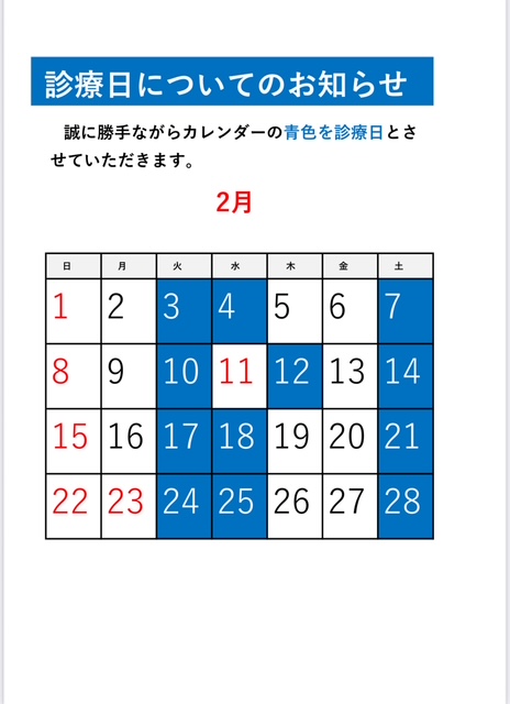 | 月 | 休診日( 祝日がある週は振替診療) | 休診日( 祝日がある週は振替診療) |